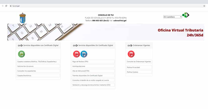 Á Oficina Virtual Tributaria, OVT, pódese acceder directamente no enderezo tui.ovt.gal ou a través da web municipal www.tui.gal no enlace “Oficina Tributaria”. Deste xeito a cidadanía pode realizar directamente a través da OVT os pagos e autoliquidacións de certificados de servizos prestados,  de procesos selectivos, realizar, consultas, acceder as súas notificacións electrónicas, realizar a alta de vehículos,  entre outros trámites.