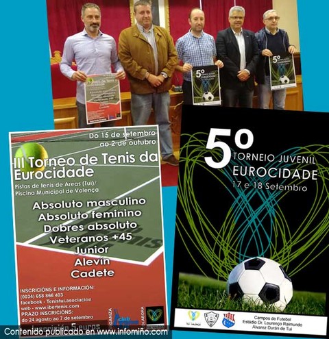 Un millar de persoas participarán nas cinco actividades deportivas se celebran este mes de setembro ao abeiro do calendario organizado pola Eurocidade Tui-Valença. Só esta fin de semana 600 deportistas competirán no III Torneo de Tenis da Eurocidade e no V Torneo de Fútbol 7. Estas dúas citas foron presentadas esta mañá na casa do concello polos responsables de deportes das dúas cidades, Laureano Alonso, e José Monte, xunto a Pablo García do Club de Tenis Tui e Elías Vieiro do Tyde F.C. e Antonio Oliveira do S.C. Valenciano.