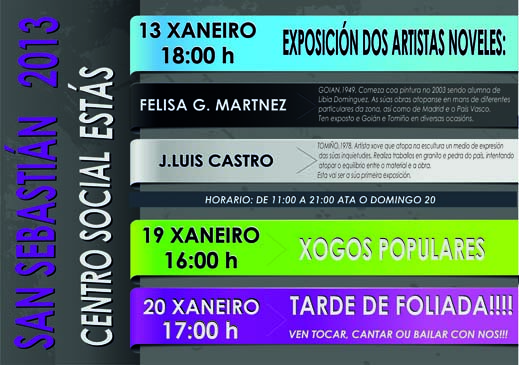 SEMANA CULTURAL: dará comezo o vindeiro domingo 13 coa inauguración da exposición de Felisa Gonzalez e J. Luis Castro que estará ata o seguinte domingo 20 en horario de 11:00 a 21:00.