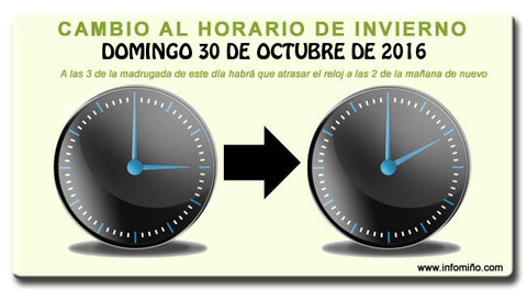 Este domingo día 30 de outubro de 2016 realizaráse o cambio ó horario de inverno o que suporá que ás 3:00h da madrugada serán as 2:00h.Ás tres voltarán a ser as dúas da madrugada