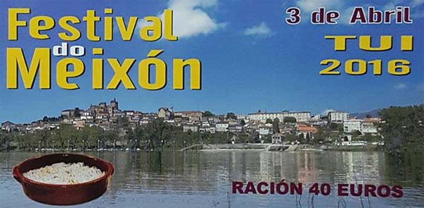 O Paseo da Corredoira acollerá este domingo, 3 de abril, a partir das 11h, o Festival do Meixón organizado polo Concello de Tui coa colaboración de distintos establecementos de hostalería da cidade. Na carpa instalada neste céntrico paseo os cociñeiros de varios restaurante locais serán os encargados de preparar 500 racións deste produto, servidas en cazola de barro e acompañadas de pan e viño albariño. O prezo da ración é de 40€, podéndose adquirir xa os tíckets en venda anticipada no Novo Cabalo Furado, no Cruceiro do Monte, en Jaqueyvi, Café Museu, Pórtico, El Cielo, La Gran Manzada e Café Boby. Tamén estarán á venda o propio domingo no recinto da festa.