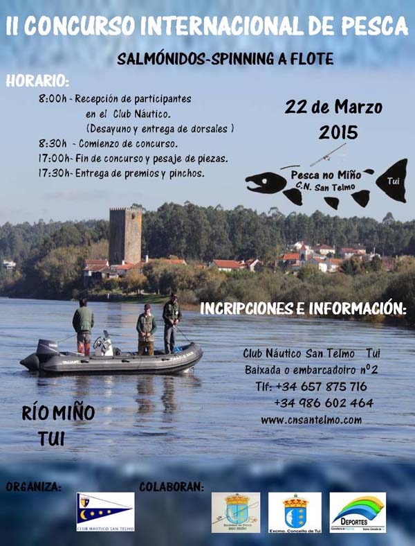 Este domingo, 22 de marzo, a partir das 08.00 horas, nas instalacións do Club Náutico San Telmo, terá lugar a segunda edición do Concurso Internacional de Pesca Deportiva de Salmónidos a Flote, organizado polo propio club, en colaboración co Concello de Tui e a Asociación de Pesca Reo Miño.