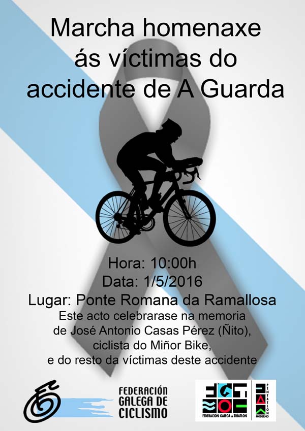Lucindo crespóns negros en sinal de loito, os participantes rodarán aproximadamente durante hora e cuarto atravesando os concellos de Nigrán, Baiona, Oia e A Guarda, onde deixarán de dar pedais no escenario do accidente, no punto kilométrico 44 da estrada PO-552.