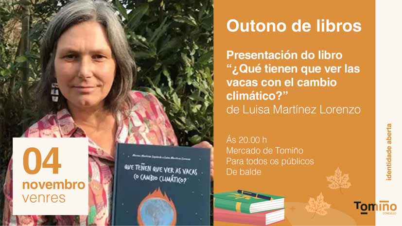 A investigadora e divulgadora estará este venres 4 de novembro no Mercado Municipal de Tomiño (20.00 h) presentando un libro que, lonxe de ser catastrofista, fala das consecuencias do fenómeno pero tamén dá as instrucións para activar o superpoder para frear o cambio climático. E quen ten ese superpoder? As persoas consumidoras. Neste libro “as autoras imprimen a súa esencia e a súa visión sobre os retos que temos por diante como especie, explicándoo cunha linguaxe sinxela e con orixinais ilustracións  e empregando a dixestión dunha vaca como fío condutor”, como explica a alcaldesa, Sandra González.
