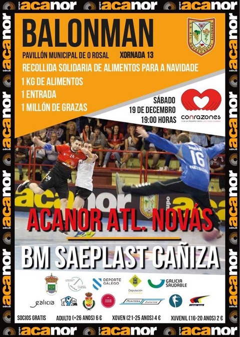 Al que colabore se le agasajará con una entrada para el partido correspondiente a la décimo tercera jornada, en la que se recibe a un Saeplast Cañiza (duodecimo clasficado) con un toque rosaleiro. Hasta tres jugadores formados en el Acanor Novás visten en la actualidad la camiseta del equipo que dirige Dani Benaches. Son Jacobo Coello, Adrián Lomba y Esteban Martínez.