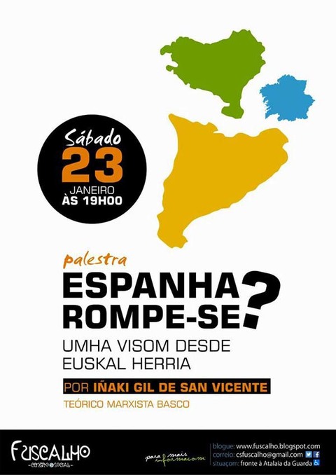 Este sábado 23 de janeiro teremos no Fuscalho a Iñaki Gil de San Vicente, um dos referentes intelectuais da esquerda independentista vasca, para falar sobre a crise territorial que se vive actualmente no Estado Espanhol A palestra leva por título "Espanha rompe-se? Umha visom desde Euskal Herria".