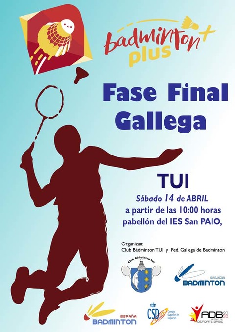 Este sábado, de 10 a 15 horas, se disputará en Tui, en el Pabellón del IES San Paio, la Final Gallega del Programa Bádminton Plus de la Federación Española de Bádminton para centros escolares.