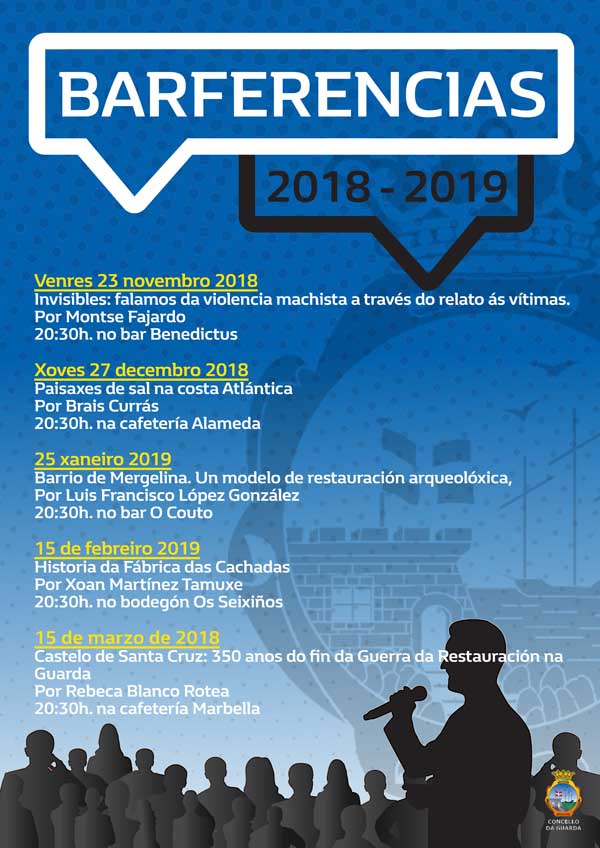 Un ano máis chegan as barferencias ós nosos bares. É este un formato que acadou grande éxito nas súas edicións anteriores, xa que permite debater e profundizar sobre diversos temas nun ambiente íntimo e distendido. Nesta nova edición volven a primar os temas históricos e arqueolóxicos, que tanto interese espertan sempre entre a nosa poboación, destacando as charlas que nos achegan os resultados das últimas intervencións arqueolóxicas nas salinas do Seixal e no Monte Santa Trega.