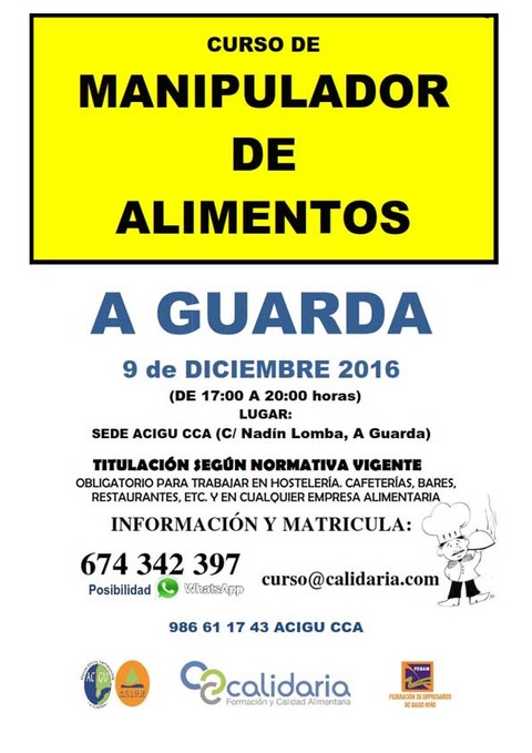 El curso de Manipulador de Alimentos se realizan el día 9 de Diciembre, viernes, en A Guarda, en la sede de Acigu CCA, Calle Nandín Lomba, de 17 a 20 horas.
