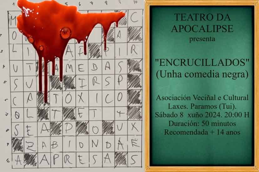 El grupo teatral del Baixo Miño, Teatro da Apocalipse, presentará su obra "Encrucillados" en el Centro Vecinal y Cultural Laxes de Paramos (Tui) el próximo sábado 8 de junio a las 20:00 horas. Con una duración de 50 minutos, esta comedia negra está recomendada para mayores de 14 años, aunque los menores también pueden asistir.