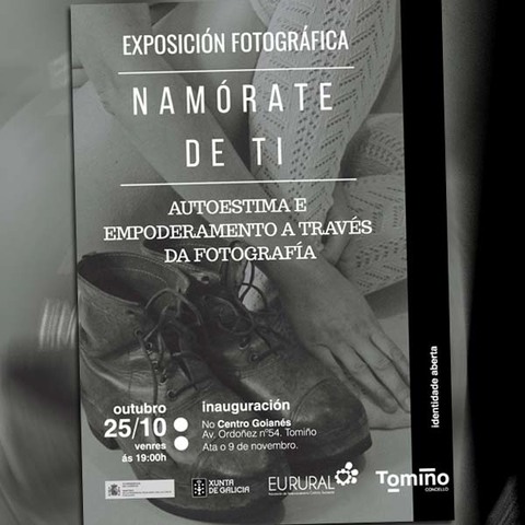 Este venres 25 de outubro ás 19:00 h. no Centro Goianés terá lugar a inauguración da exposición fotográfica "Namórate de ti", que se enmarca no proxecto do mesmo nome, promovido pola Asociación de Desenvolvemento Galicia Suroeste Eu Rural e o Concello de Tomiño. A exposición contará coas fotografías resultantes do traballo desenvolvido na fase anterior, nas que mulleres de diversas idades ao longo de varias sesións traballaron intensamente cuestións relacionadas coa autoestima, o autoconcepto, a vida consciente, a cooperación, a desinhibición e o empoderamento, entre outros. O obxectivo do proxecto é mellorar a calidade de vida das mulleres participantes, potenciando as súas cualidades e capacidades. Este proxecto conta co financiamento do Ministerio de la Presidencia, Relaciones con las Cortes e Igualdad, e a Xunta de Galicia.