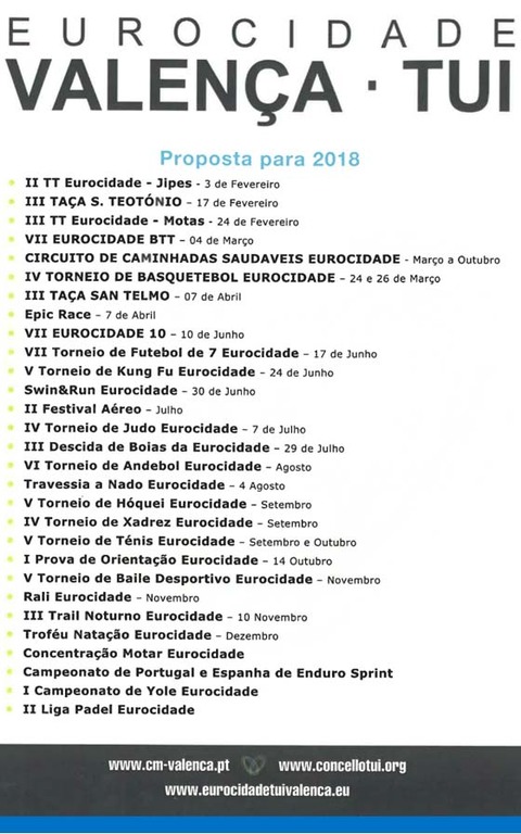 35 eventos desportivos, em 19 modalidades, dão corpo à programação da Eurocidade do Desporto 2018. Esta é uma aposta concertada de Valença e Tui e das suas associações desportivas na consolidação do projeto da Eurocidade, o programa desportivo transfronteiriço mais completo da União Europeia.
