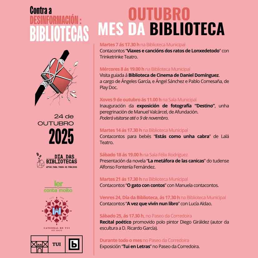 O Concello de Tui organiza nove actividades especiais ao longo de outubro para celebrar o Día da Biblioteca, con contacontos, exposicións, presentacións literarias e recitais poéticos.