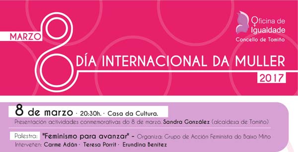 O acto organizado polo Grupo de Acción Feminista do Baixo Miño en colaboración co Concello de Tomiño terá lugar este mércores dia 8, ás 20:30 na Casa da Cultura de Tomiño, que rematará nun coloquio aberto para tod@s @s veciñ@s da comarca.