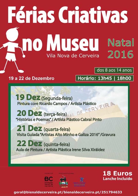 A Fundação Bienal de Arte de Cerveira promove, de 19 a 22 de dezembro, as Férias Criativas no Museu Natal 2016, para jovens dos 8 aos 14 anos. As atividades decorrerão durante a tarde (13h45 - 18h00), proporcionando aos mais novos um programa multidisciplinar e repleto de criatividade, de destacar: