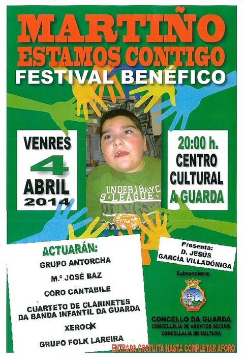 O venres 4 de Abril, ás 20.00 h levarase a cabo no Centro Cultural da Guarda o festival benéfico "Martiño Estamos contigo", no que colabora o Concello da Guarda.