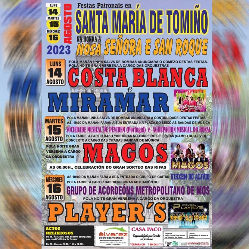 La Comisión de fiestas ha querido agradecer al Concello, a la Deputación de Pontevedra, a la Comunidad de Montes de Tomiño y principalmente a los vecinos y vecinas de la parroquia de Santa María la colaboración y ayuda prestada a la hora de organizar estas fiestas. Igualmente, invita a todos y todas a que asistan a la misma.