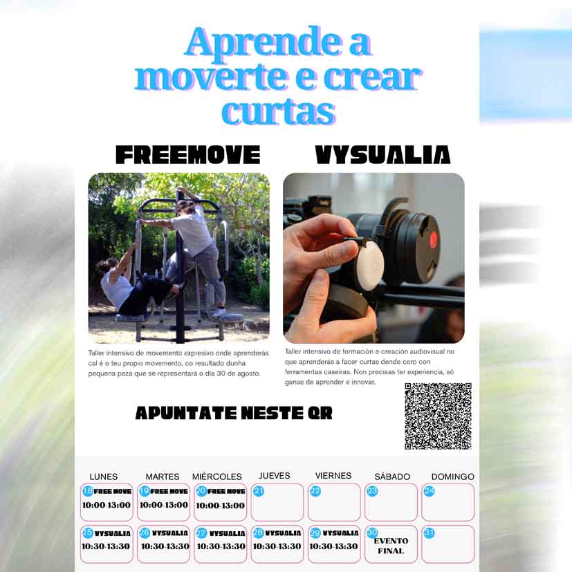 El primero de ellos, Free Move, se celebrará del lunes 18 al miércoles 20 de agosto, con sesiones tanto de mañana (10:00 a 13:00 horas) como de tarde (15:00 a 17:30 horas). El taller, coordinado por Xiana Aldea y Sara González, está dirigido a jóvenes de entre 15 y 20 años, con un máximo de 7 plazas. Su objetivo es acercar a los participantes al movimiento expresivo, explorando nuevas formas de comunicación artística.