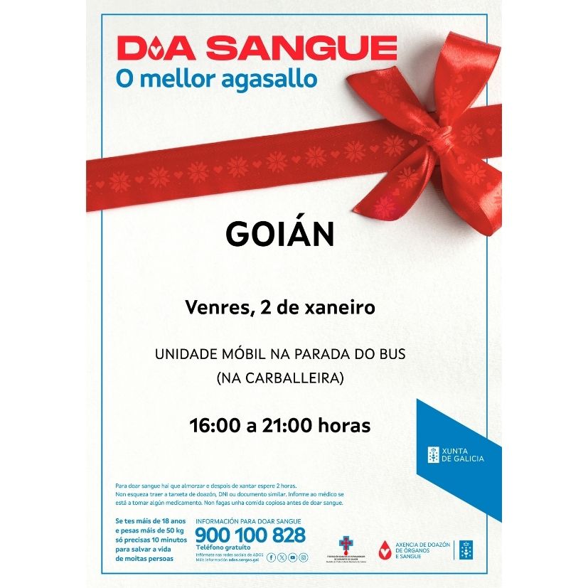 El Concello de Tomiño da la bienvenida al 2026 con una nueva campaña de solidaridad. Este viernes 2 de enero, una unidad móvil de la Axencia Galega de Doazón de Órganos e Sangue (ADOS) estará instalada en la parada del bus de A Carballeira, en Goián, de 16:00 a 21:00 horas, abierta a todas las personas que deseen contribuir con su donación de sangre.