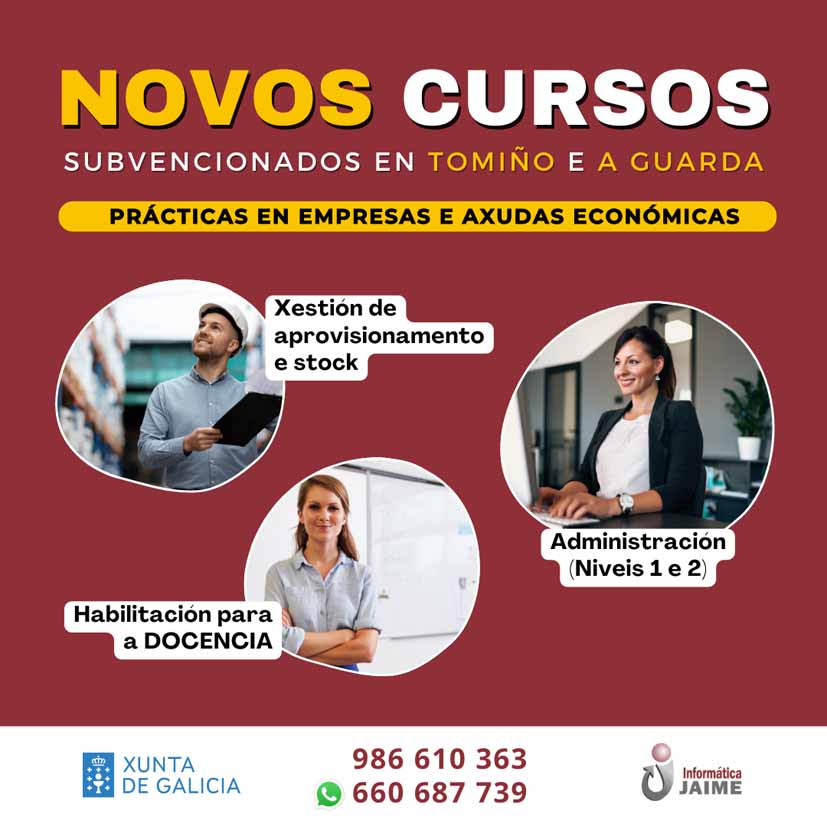 Informática Jaime lanza nuevos cursos 100% subvencionados en A Guarda y Tomiño, con certificaciones oficiales, ayudas económicas y prácticas en empresas. ¡Inscríbete y asegura tu futuro laboral!