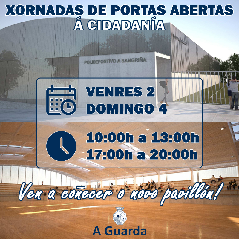 El Concello de A Guarda realiza los próximos 2 y 4 de diciembre unas jornadas de puertas abiertas en el nuevo Pabellón Deportivo Municipal de A Sangriña. Todo aquel que lo desee podrá visitar las nuevas instalaciones, una vez concluidas las obras de renovación, en estas jornadas en horario de 10.00 a 13.00 horas y de 17.00 a 21.00 horas.
