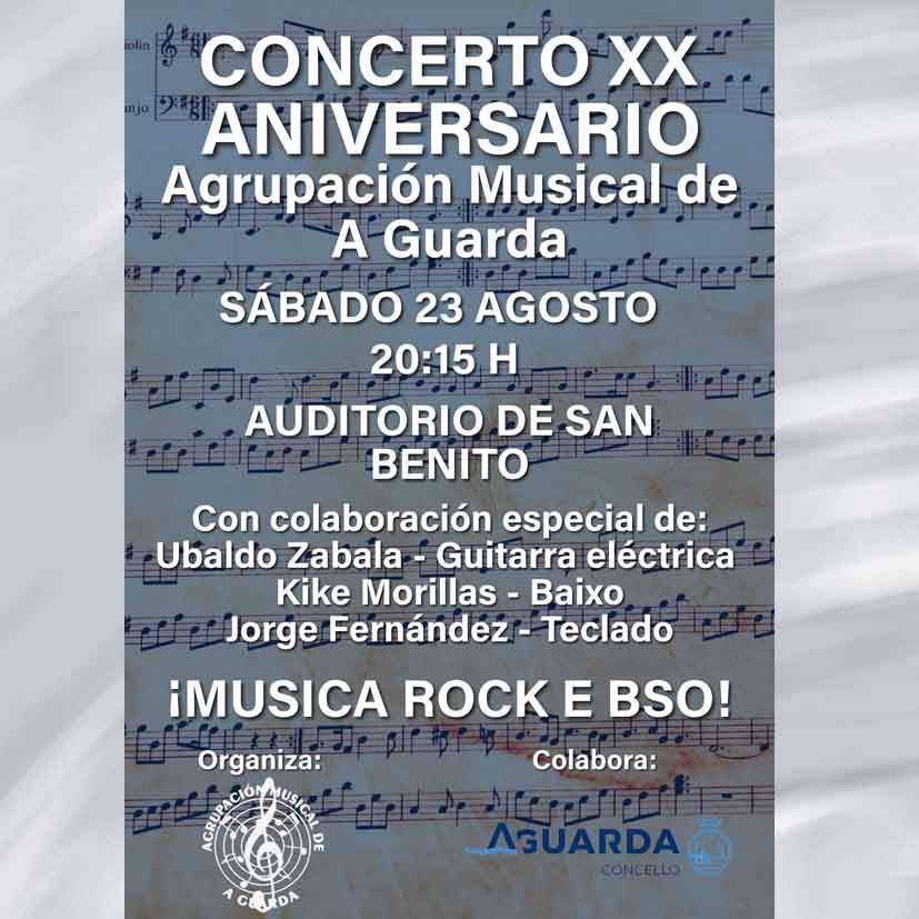 La Agrupación Musical de A Guarda, con dos décadas de historia, ha consolidado su papel como referente cultural en la localidad, participando en actos, festivales y celebraciones tanto a nivel local como en otros municipios de Galicia y Portugal. Este concierto pretende ser un homenaje a su trayectoria y una celebración junto a vecinos, socios y amantes de la música.