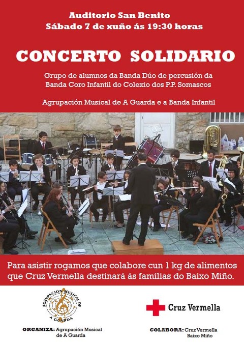 El próximo 7 de Junio a partir de las 19.30 se celebrará un concierto en el Auditorio de San Benito de A Guarda, a favor de Cruz Roja Baixo Miño organizado por la Agrupación musical de A Guarda.