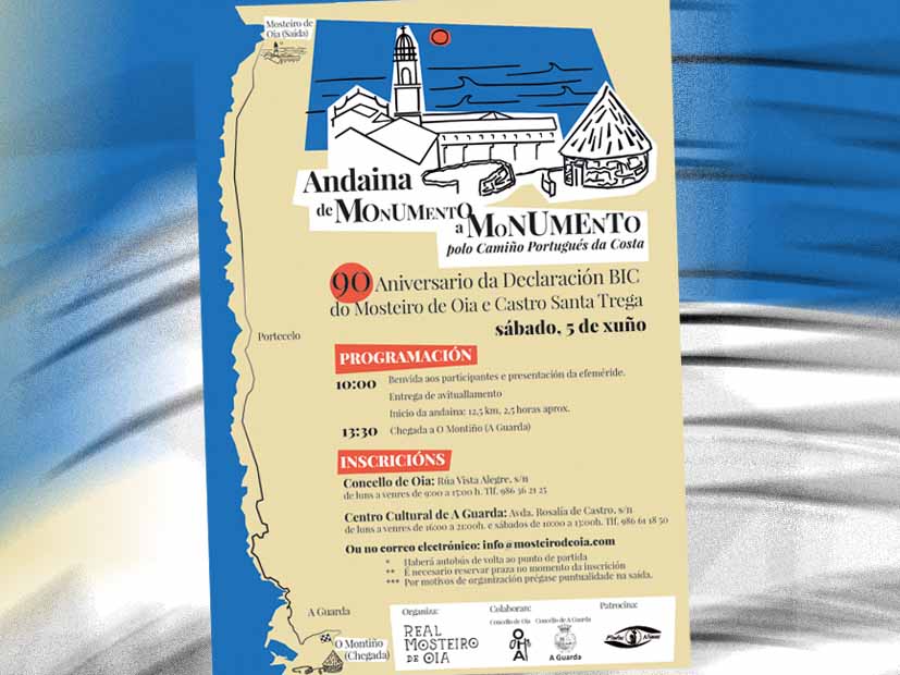 Por todos estos motivos, el Monasterio de Oia tomó la iniciativa de conmemorar tal acontecimiento organizando la Andaina con la colaboración de los ayuntamientos de Oia y A Guarda, y contando además con el patrocinio de Frutas Neves. Bajo el nombre ‘de Monumento a Monumento’, la andaina tendrá lugar el próximo 5 de junio, saliendo a las 10 de la mañana del Monasterio de Oia para recorrer 12,5 Kms por la costa hasta O Montiño en A Guarda. Las inscripciones podrán hacerse en el Concello de Oia, el Centro Cultural de A Guarda o en el email info@mosteirodeoia.com hasta agotar las plazas.