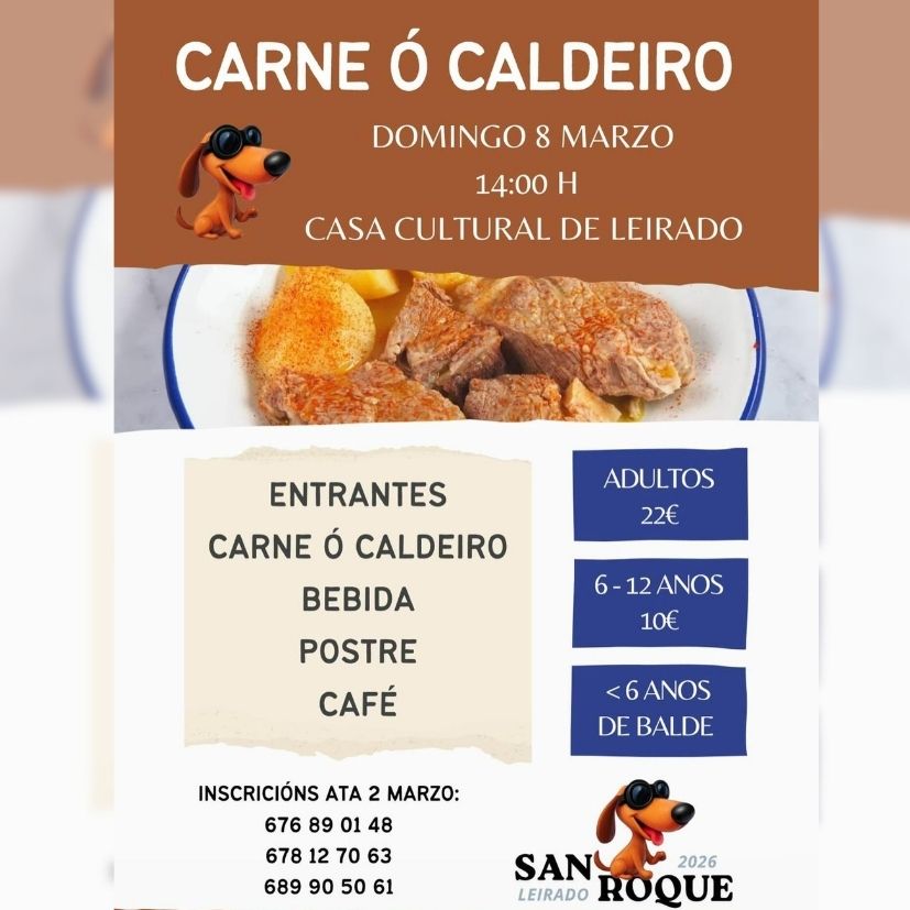 El domingo 8 de marzo, a las 14:00 horas, la Comisión de San Roque de Leirado organiza una comida de carne ó caldeiro en la Casa de la Cultura con un menú completo e inscripciones ya abiertas.