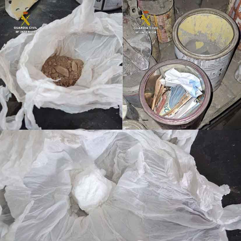 Durante la inspección del local y del material de trabajo existente en sus instalaciones, los agentes localizaron botes de pintura que ocultaban en su interior envoltorios blancos y bolsas de envasado al vacío.
