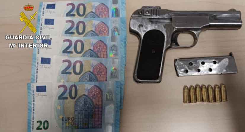 Antes de proceder a su identificación, el copiloto hizo un movimiento sospechoso, agachándose en el asiento, lo que llevó a los agentes a registrar el vehículo. En la inspección, encontraron debajo del asiento delantero derecho un arma corta de fuego marca BROWNING, calibre 7,65, con un cargador que contenía siete cartuchos metálicos.