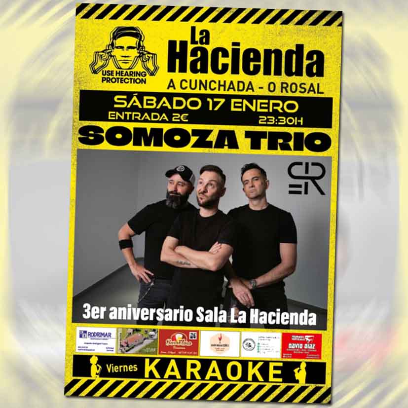 Somoza Trío llega a O Rosal con su característico directo, basado en un sonido potente y personal que mezcla rock, versiones y temas propios, consolidándose como una propuesta habitual en salas y festivales de Galicia. Su presencia servirá para poner el broche musical a un aniversario muy especial para La Hacienda, que cumple tres años como punto de referencia del ocio nocturno y la música en vivo en la comarca.