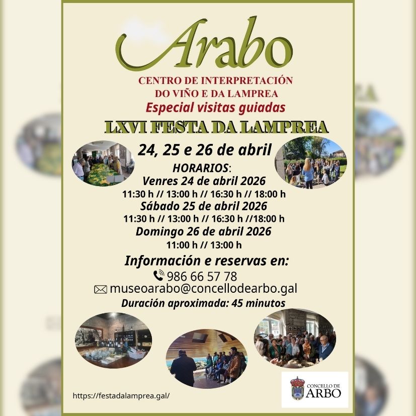 El Concello de Arbo volverá a poner en valor su patrimonio cultural, histórico y gastronómico con un programa especial de visitas guiadas gratuitas al Centro de Interpretación del Vino y la Lamprea Arabo, coincidiendo con la celebración de la LXVI Festa da Lamprea, que tendrá lugar los días 24, 25 y 26 de abril de 2026.