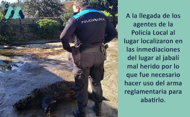A la llegada de los agentes de la Policía Local al lugar localizaron en las inmediaciones del lugar al jabalí mal herido por lo que fue necesario hacer uso del arma reglamentaria para abatirlo.