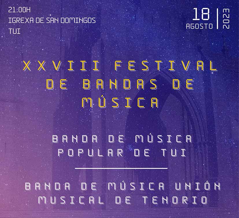 Este viernes 18 de agosto se celebra el XXXVIII Festival de Bandas de Música, en el que participarán la Banda de Música Popular de Tui y la Banda de Música Unión Musical de Tenorio de Cercedo-Cotobade. El evento estaba inicialmente previsto en la plaza de San Fernando, pero debido a la previsión de lluvia se ha trasladado a la iglesia de San Domingos.