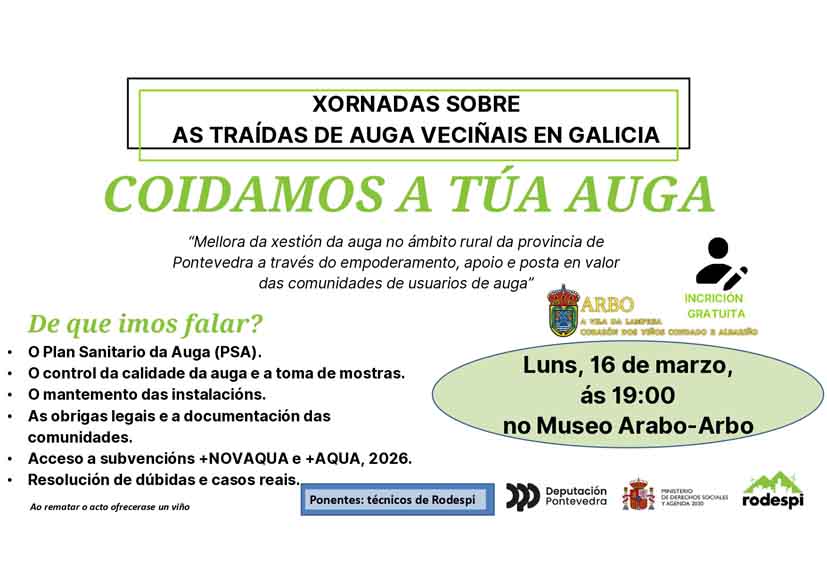 Desde la organización se ha hecho un llamamiento a todas las comunidades de aguas de Arbo y de municipios limítrofes para que participen en esta sesión informativa.