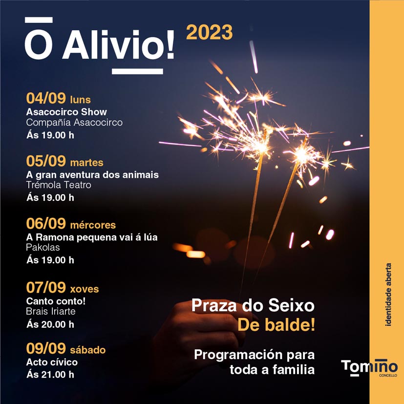 Como es habitual, la programación cultural de las fiestas culminará con el Acto Cívico do Alivio, en el que se homenajeará a una persona vinculada a la historia de Tomiño y en el que también participará la Agrupación Musical de Goián. Este evento de cierre de fiestas se celebrará el viernes 9 a las 21.00, de nuevo en la Praza do Seixo.