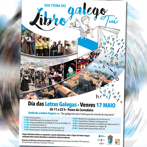 Haberá 20 postos de libros no Paseo da Corredoira das librarías Espazo Lector Nobel e Iris, de 11.00h a 22.00h, que ofrecerán un 10% de desconto. Ademáis exporanse Maios e paneis informativos sobre a figura do historiador e xeógrafo, Antón Fraguas, realizados polos centros educativos e asociacións culturais de Tui.