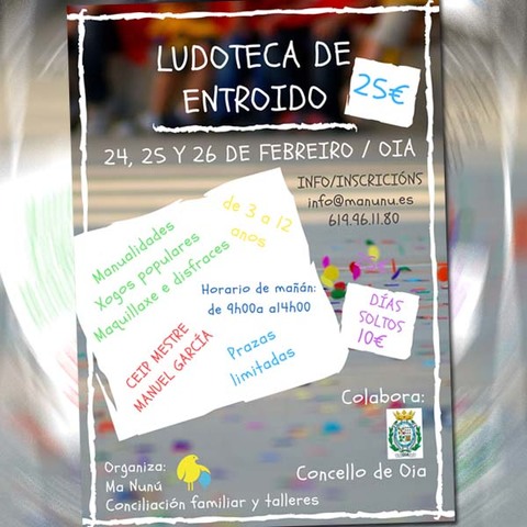 A ludoteca de entroido ten un prezo de 25 euros para os tres días, aínda que tamén existe a opción de ir días soltos (10 euros cada día). As prazas son limitadas. Máis información e inscricións en info@manunu.es e no teléfono 619.96.11.80