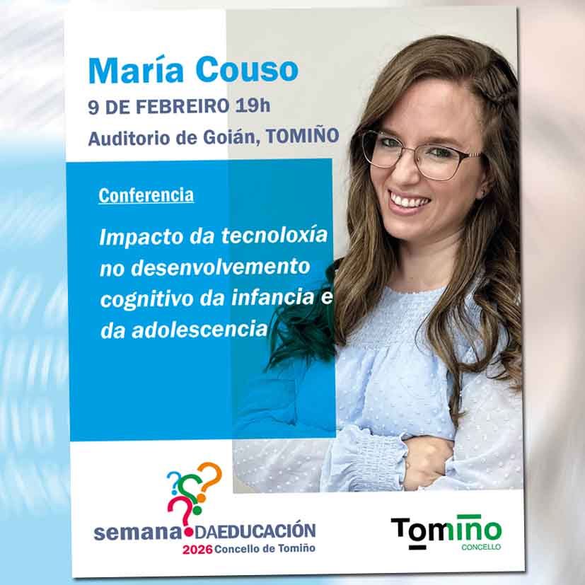 La programación arrancará el lunes 9 de febrero a las 19.00 horas, en el Auditorio de Goián, con la conferencia “Impacto de la tecnología en el desarrollo cognitivo de la infancia y de la adolescencia”, a cargo de María Couso, pedagoga y una de las principales divulgadoras a nivel estatal sobre desarrollo infantil, juego y neuroeducación. La entrada será gratuita.