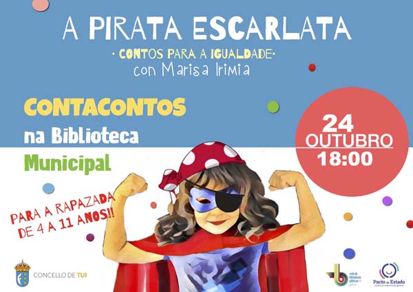 Este xoves, 24 de outubro, celébrase o Día da Biblioteca. Dentro do programa de actividades para conmemorar esta data a Biblioteca Pública Municipal de Tui acolle precisamente este xoves ás 18 h a Marisa Irimia co contacontos "A pirata Escarlata". Esta actividade vai dirixida a nenos e nenas de 4 a 11 anos. Achéganos á historia de rapazas que capitanean perigosos barcos piratas, rapaces que pilotan naves espaciais, nenas e nenos que viven emocionantes aventuras, que xogan, elas e eles, un papel activo en mil e unha andanzas. Esta actividade forma parte do programa de animación á lectura Ler Conta Moito e ao Pacto de Estado en contra da violencia de xénero.