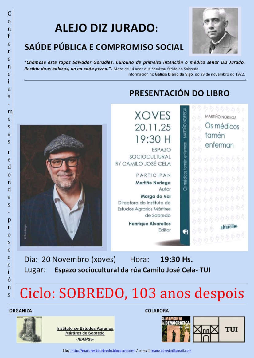El municipio de Tui acogerá mañana jueves, 20 de noviembre, a las 19:30 horas, una nueva conferencia del ciclo "Sobredo, 103 años después", integrada en el "Mes de la Memoria". El médico y exalcalde de Teo y de Santiago de Compostela, Martiño Noriega, presentará su libro "Los médicos también enferman" en el Espacio sociocultural de la calle Camilo José Cela. Además, Noriega estará acompañado por el editor Henrique Alvarellos y por la presidenta del Instituto de Estudios Agrarios Mártires de Sobredo (IEAMSo), Marga do Val.