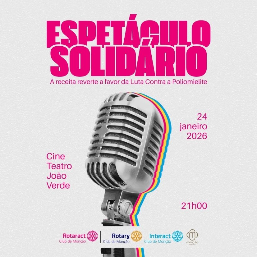 El Concello de Monção, junto con el Rotaract Club, Rotary Club e Interact Club de Monção, organiza el Espetáculo Solidário el próximo sábado 24 de enero, a las 21:00 horas, en el Cine Teatro João Verde. Las entradas tienen un precio simbólico de 5 €, y toda la recaudación se destinará a la lucha contra la poliomielitis, la parálisis infantil, una de las causas principales del Rotary a nivel internacional.