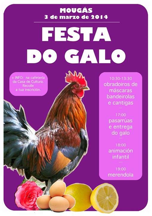 Mougás recuperará este ano unha tradición que se perde na memoria colectiva da parroquia. O GALO. O día 3 de Marzo vindeiro celebrarase a festa tradicional do GALO. Para máis información, preguntar cafetería da casa da Cultura ( Conchi).