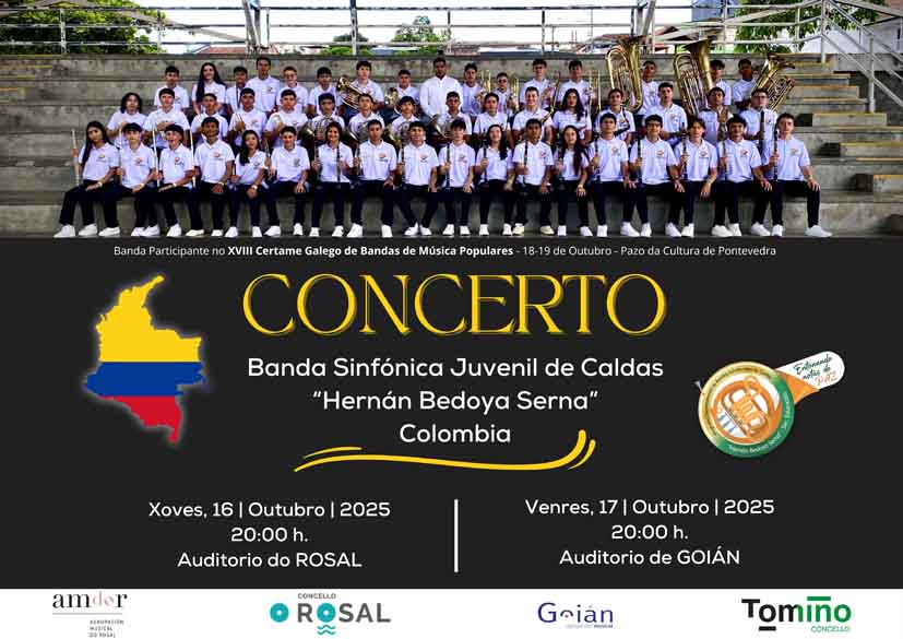 El Auditorio Municipal de O Rosal acoge este jueves 16 de octubre, a las 20:00 horas, un concierto gratuito de la Banda Sinfónica Juvenil de Caldas -Hernán Bedoya Serna-, procedente de Colombia y dirigida por Juan Sebastián Velasco Serna.
