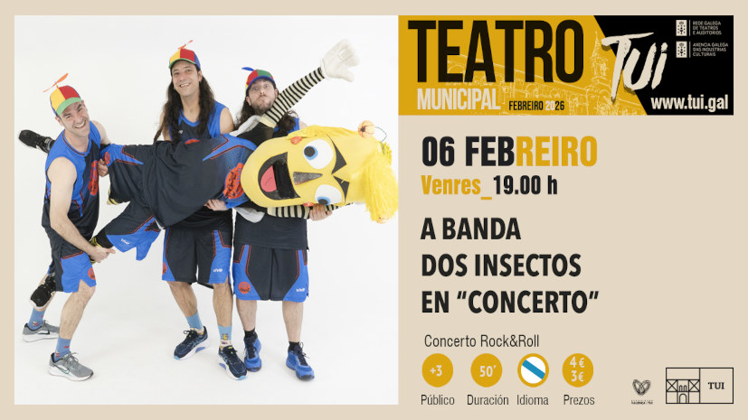 El Teatro Municipal de Tui inaugura el mes de febrero con música en directo para toda la familia. Este viernes, 6 de febrero, sube al escenario del Teatro Municipal de Tui A Banda dos Insectos, un grupo formado por Adri Salgado (batería y voz), Eduardo Cadenas (bajo y coros), Juan Pérez (guitarra y coros) y Manuel Fernández, encargado de la animación.