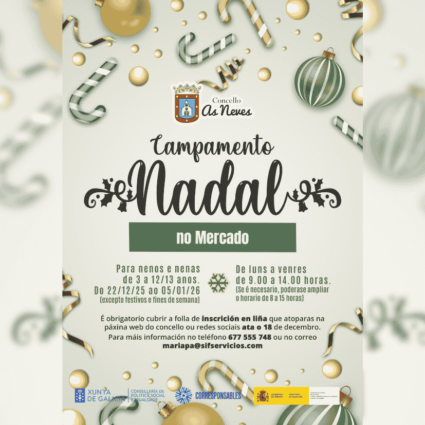 El campamento está dirigido a niños y niñas de 3 a 12/13 años y se desarrollará del 22 de diciembre al 5 de enero, excepto festivos y fines de semana, en las instalaciones del Mercado Municipal de As Neves. El horario habitual será de 09:00 a 14:00 horas, con posibilidad de ampliación de 08:00 a 15:00 horas si fuera necesario para facilitar la conciliación familiar.