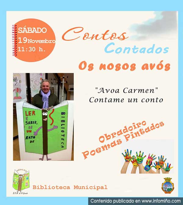Convídase ás familias da Guarda a acudir este sábado á Biblioteca e poder así darlle a homenaxe que merecen tódolos avós e avoas da vila, nunha mañá para desfrutar en familia. Ademais recórdase que a programación dos Contos Contados se estenderá ata o fin de curso e continuará o vindeiro mes de decembro, concretamente o sábado 17, cunha data moi especial centrada, como non podía ser doutro xeito, no Nadal.