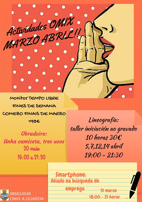 A OMIX do Concello da Guarda sigue adiante coa programación de actividades de formación e lúdicas previstas para os próximos meses. Os cursos programados son: