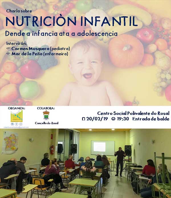 Charla sobre nutrición infantil: dende a infancia ata a adolescencia. Intervirán Carmen Mosquera (pediatra) e Mar de la Peña (enfermeira). A charla será o 20-2-19 ás 19:30 no Centro Social Polivalente do Rosal.